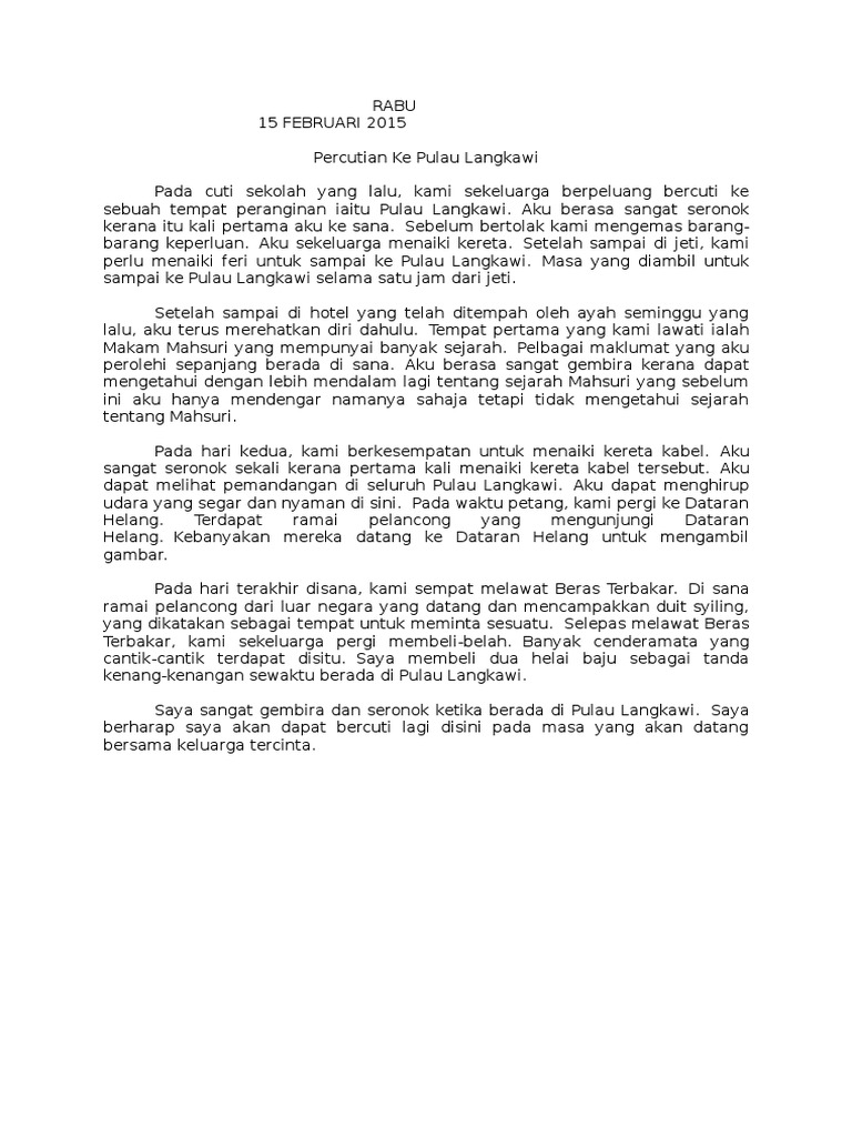 Ramai orang cakap kalau bercuti ke Langkawi hanya aktiviti di air sahaja yang menarik dilakukan seperti snorkeling berkejaran di gigian pantai sukan air seumpamanyaSebenarnya banyak lagi aktiviti menarik di Langkawi yang lain tetap best yang boleh dilakukan. Contoh karangan surat kiriman rasmi. Contextual translation of contoh karangan bercuti di pulau langkawi into English.